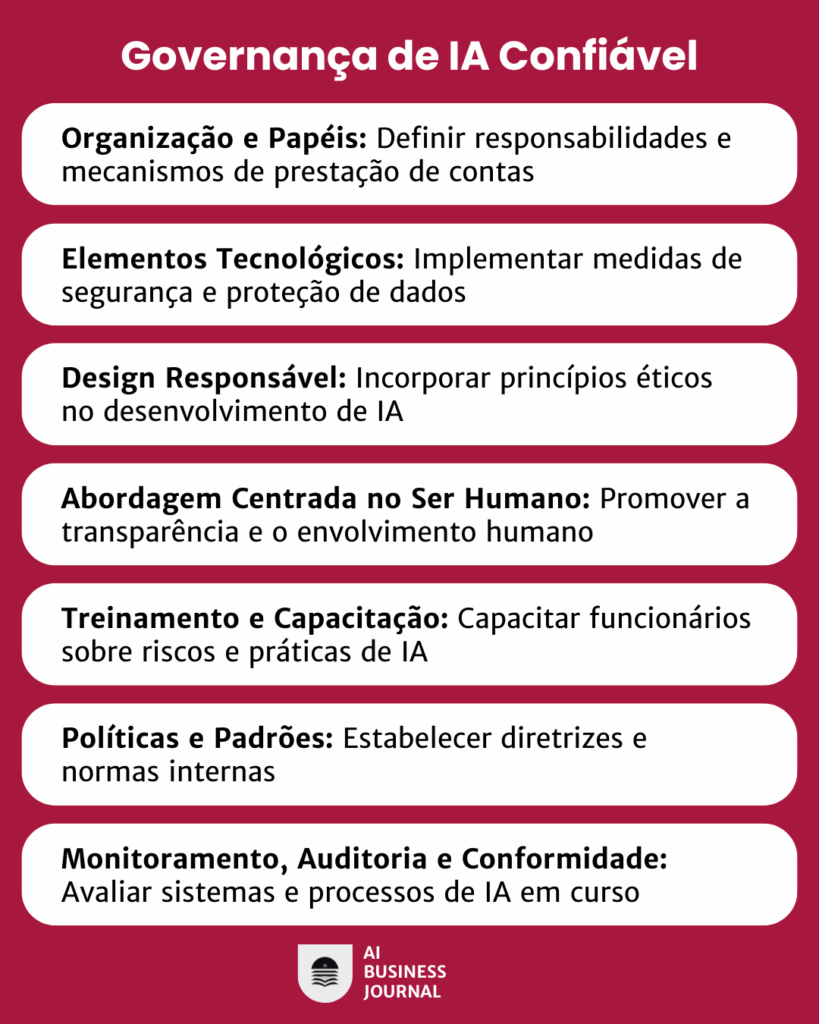 Com base em boas práticas de mercado e nos principais frameworks internacionais (como OECD, ISO/IEC 42001 e o AI Act Europeu), podemos agrupar as medidas adotadas pelas empresas em sete grandes categorias que estruturam um modelo de governança de IA confiável: